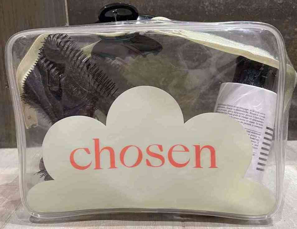 On peut notamment obtenir des articles personnalisables 100 % sur mesure. Pour ses coiffeurs qui vont à domicile chez les clients, notre client Chosen Paris a choisi cette trousse transparente siglée :
